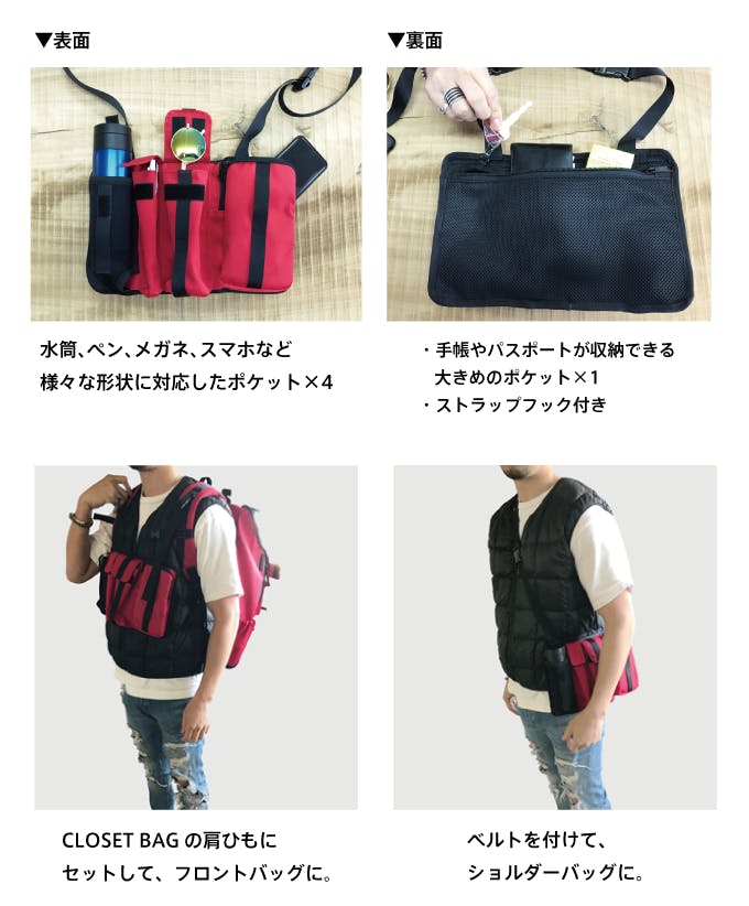 CLOSET BAGの肩ひも部分にセットして使用するフロントバッグです。
