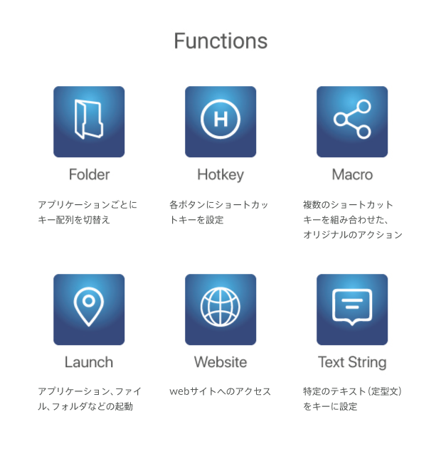 特定のテキスト(定型文)をキーに設定することができます。 よく使うプログラミングコードなど、複雑で長い文字列を1ボタンで入力することができます。
