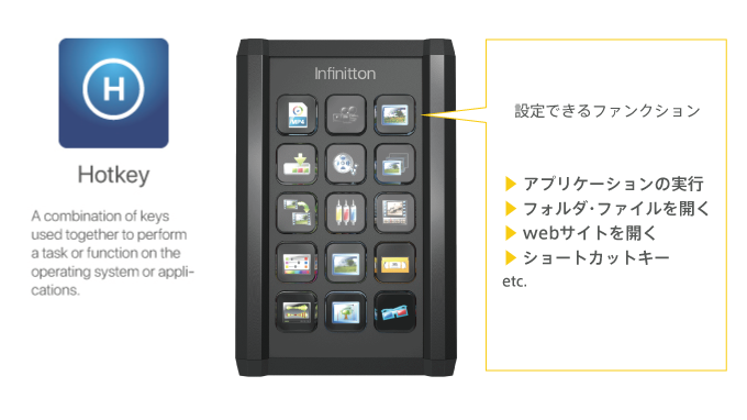 使い方は、一般的なキーボードと同じ。 ファンクションが割り当てられたキーを押して、ファイル、フォルダ、プログラム、ウェブサイトを起動させることができます。