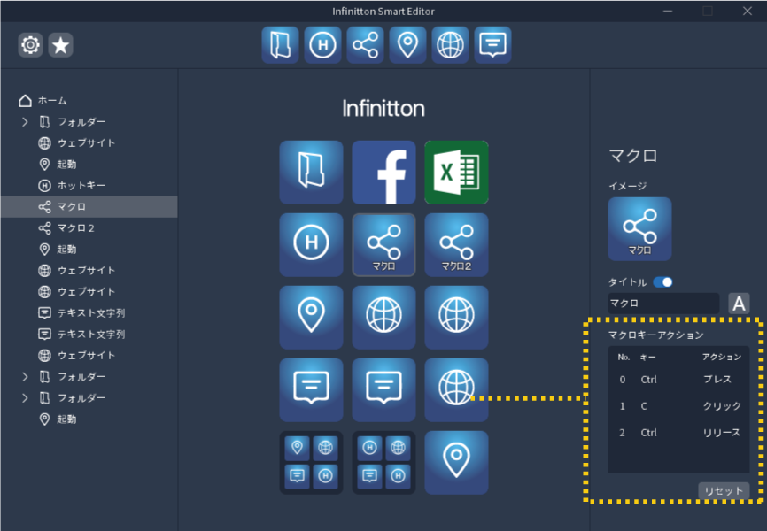 「マクロキーアクション」・・・ファンクションを実行するコマンドを入力できます。