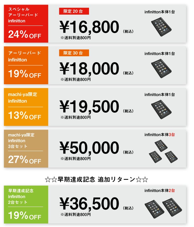 ※ 既に複数ご支援をいただいている方や、19,500円コースご支援済みの方で乗り換え希望の方は2台セットへご支援後に「お名前」「メールアドレス」を事務局(support.machi-ya@mediagene.co.jp )までご連絡ください。