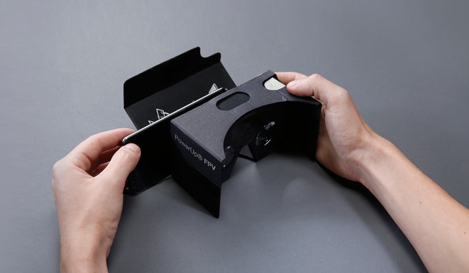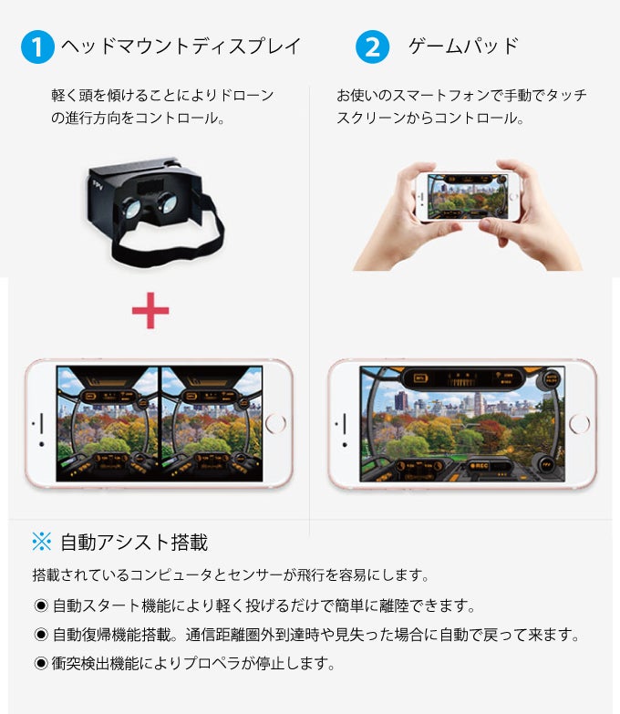 スマートフォンをヘッドマウントディスプレイ(※ 上記ヘッドマウントディスプレイは別売り)に着用すると、機体からの景色を楽しみながら操縦できます。