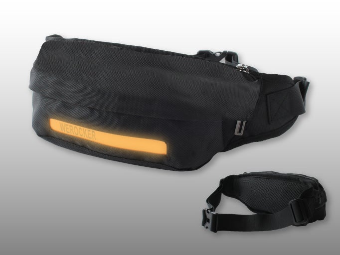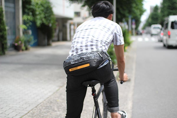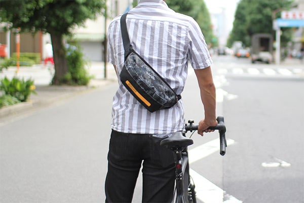 同素材のオプションバッグ(別売)ももちろん光ります。ライド時はウェストバッグにすることで、視認性UPかつ動きの邪魔にならない装着が可能ですし、タウンユースではショルダーバッグにすることで野暮ったさも解消されます。