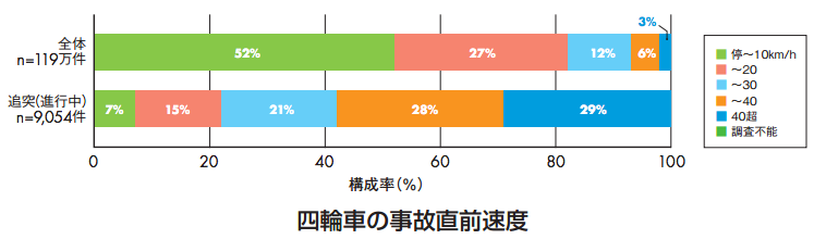 追突(進行中)事故では「40km/h超」が29%。このように追突(進行中)事故は“四輪車の事故直前速度が速い事故”と言えます。