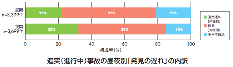 追突(進行中)事故における「漫然運転」の割合を昼夜別に見ると昼間より夜間が多く、夜間になると更に自転車の存在を見落していることがわかります。