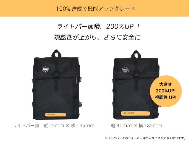 100%達成の際にはバックパックのライトバー部分面積の拡大を「高さ20mm×幅145mm」から「高さ40mm×幅185mm」とお伝えしておりましたが、サンプル作成においてステッチ部分との干渉が発生することが発覚しました。