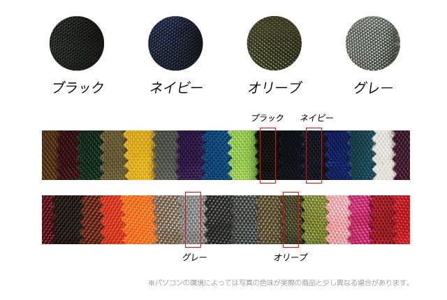 ※ バッグの生地が上記のカラーとなります。パーツ類(ストラップやプラスチックバックル等)は黒のままになります。