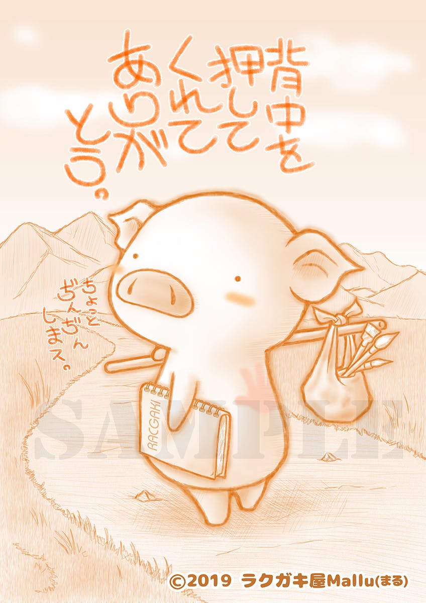 2019/11/22 23:27ご無沙汰しております。ラクガキ屋Mallu(まる)です。リターン品の「オリジナルイラスト」が完成しましたのでご案内します。予定より大幅に遅れてしまい誠に申し訳ありません!!お送りする際には「背中を」の前に、ご指定頂いたお名前をお入れします。リターン品で【オリジナルトートバッグ+CF限定・オリジナルイラスト】 をお選び頂いた皆様に後日お送り致します。お届けまでもうしばらくお待ちください。※実物には「SAMPLE」「(C) 2019ラクガキ屋Mallu(まる)」の表記は入りません。 もっと見る
