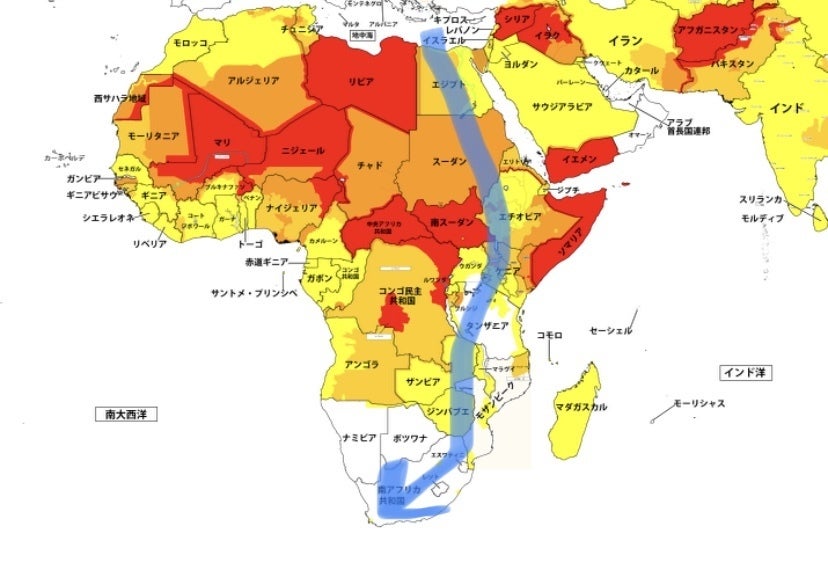外務省HPにて危険レベル3のスーダンは空路で飛ばし、それ以外は原則陸路を使う予定です。