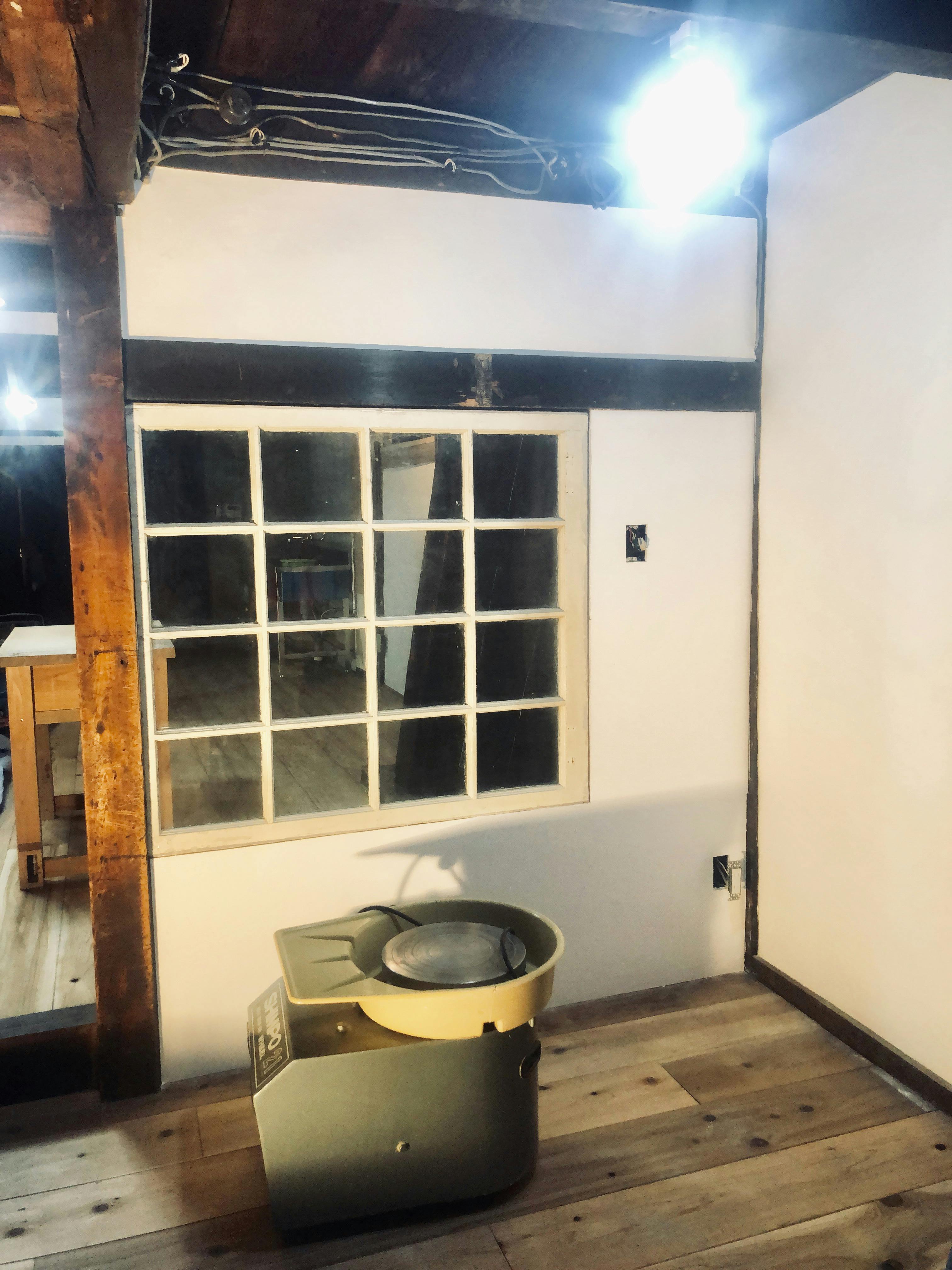 タタラ作り用の型、手回しろくろ、下絵の具。こじんまりとした空間なので定員は7名と少なくし、落ち着いて制作していただけるようにしていきます。