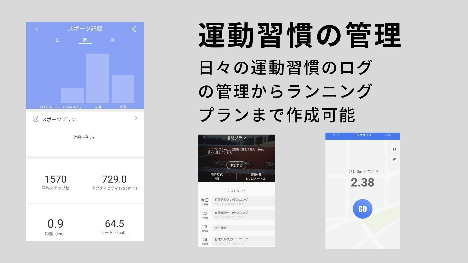 また、ランニング時のリアルタイムの心拍数、時間、距離、カロリー等を記録することができ、アプリで管理することも可能。
