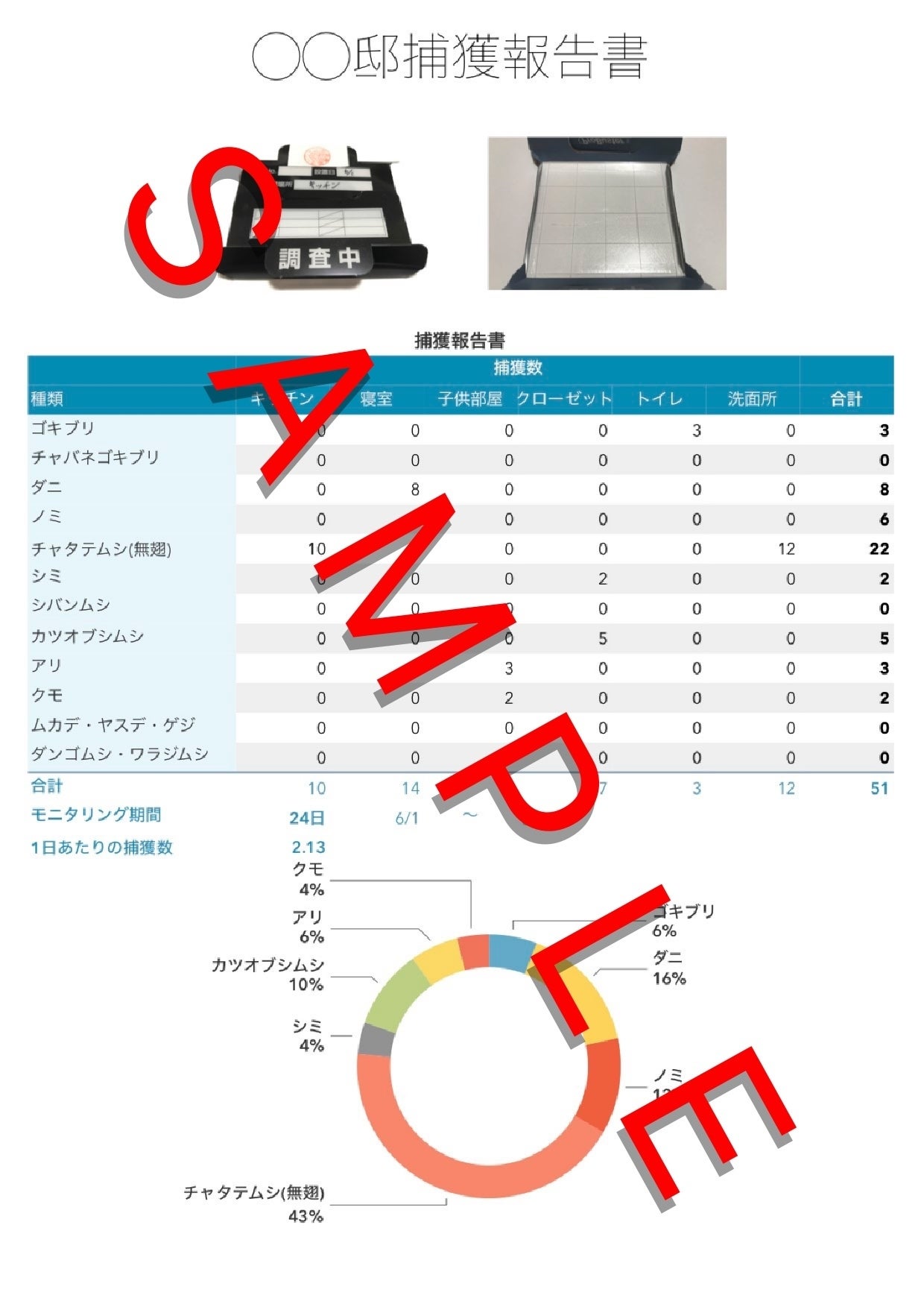しかし、設置場所以外のお部屋、屋外からの誘引の可能性もあり、「ムシトリア」における目的、自然数による対策提案を阻害するおそれがあるため、当サービスには含まないものとします。