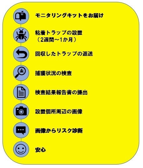 世の中に一般家庭に向けた害虫駆除を行っている企業・業者はたくさんありますが、私たちが提供したいモニタリングサービスはその前の段階、虫の有無を捕獲によって判断をし、その状況から適切な対策を推奨するものです。