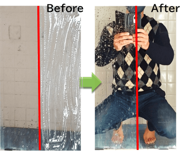 ※鏡についたウロコ汚れや石灰化した水垢汚れ(金属石鹸)は分解除去できません。