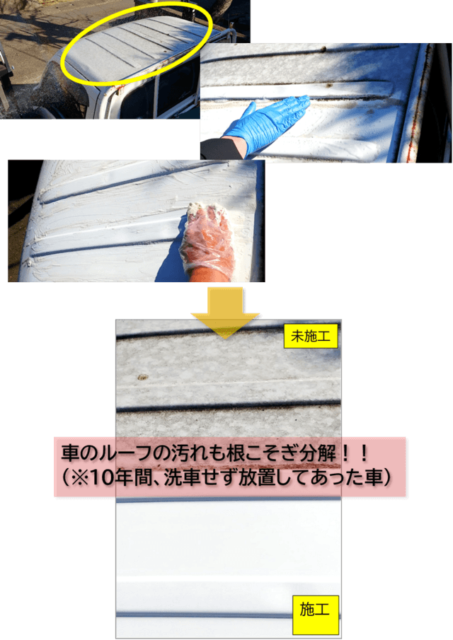 このように、車の撥水コーティング(油膜剤)も容易に落としてしまうので、頑固な水垢やピッチタールなども楽に剥離することが可能です。