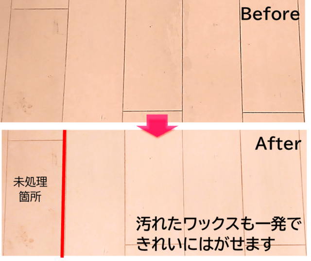 5分間放置して、雑巾で拭き上げればきれいさっぱりワックスは除去されます。