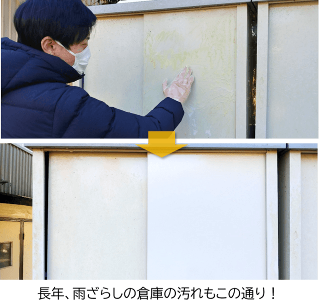 長年屋外で雨ざらしのままの倉庫の汚れ落としにもチャレンジしてみました。