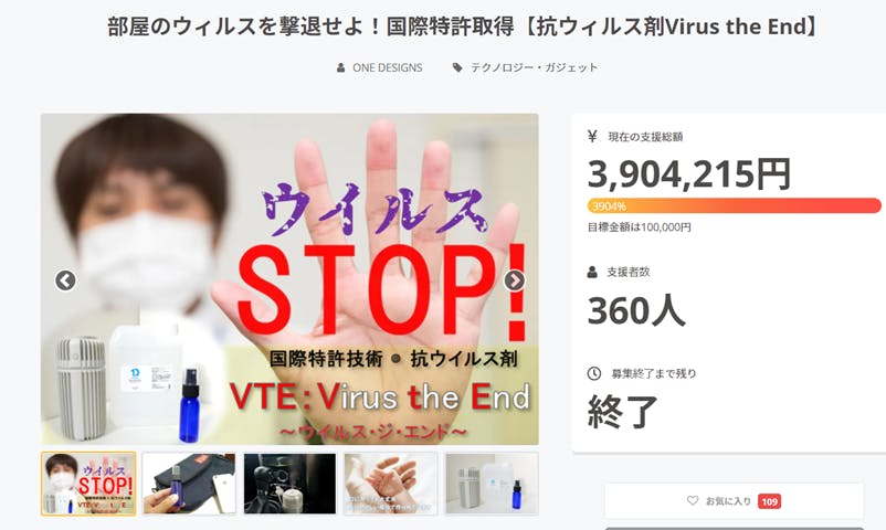 「部屋のウィルスを撃退せよ!国際特許取得【抗ウィルス剤Virus the End】」
