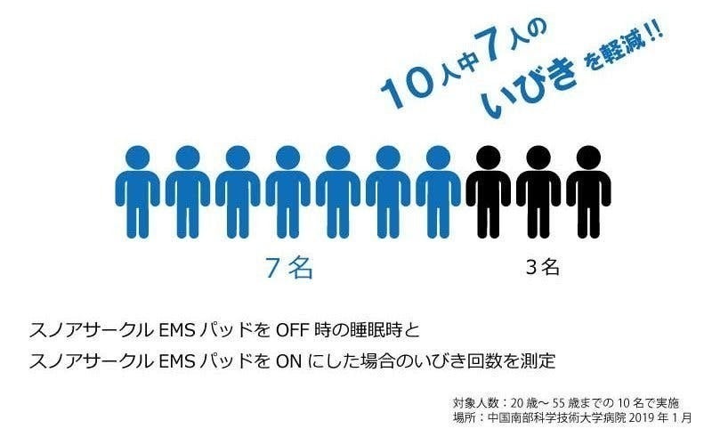 医療機関において20代~50代までの10名を対象にスノアサークルEMSパッドの機能をONにして寝た場合とOFFにして寝た場合のいびきの発生回数の測定をしたところ、いびきの発生回数が10人中7名軽減されたことが実証されました。
