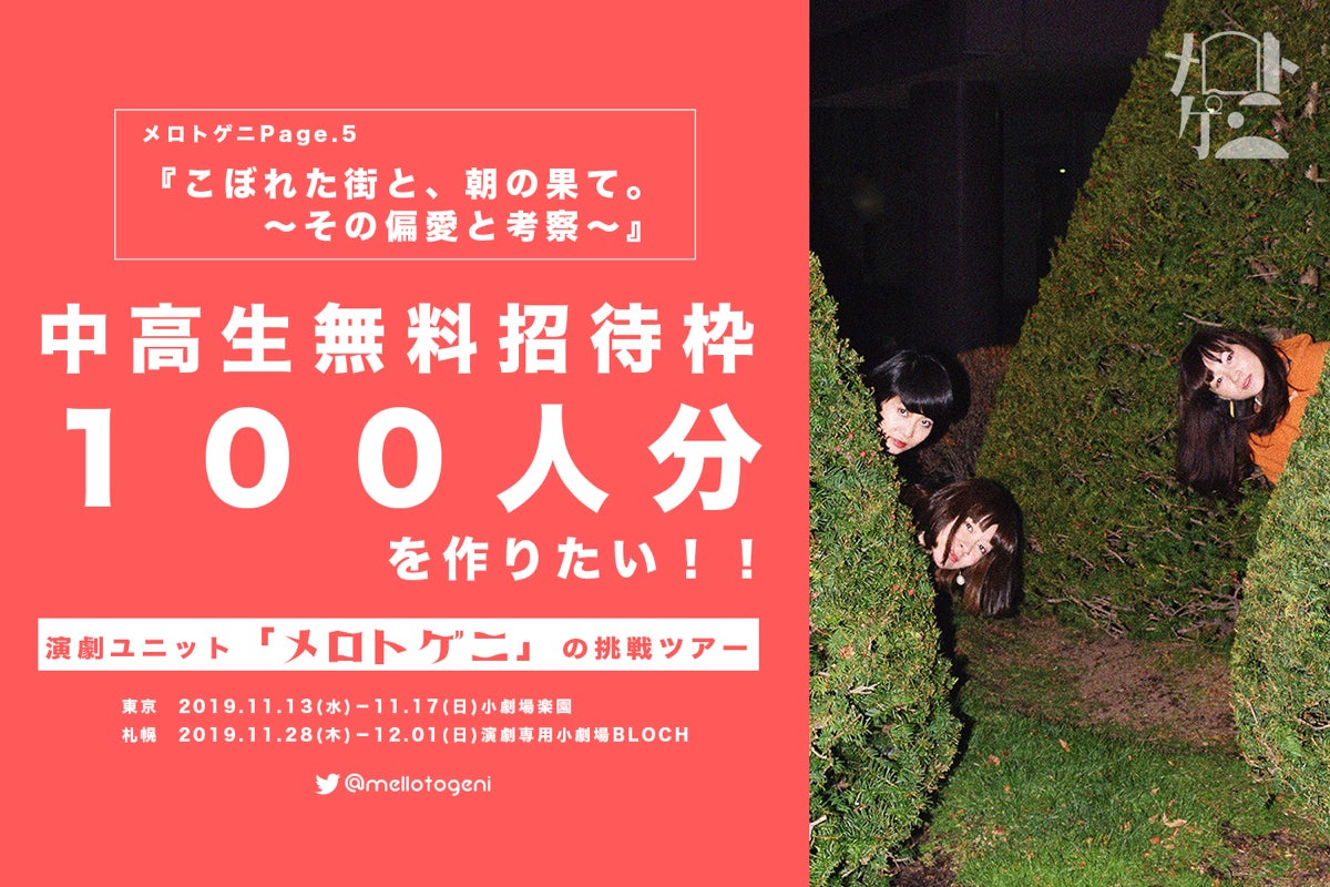 ※中高生のご支援者さまへ→チケットそのものをお求めの方は、このプロジェクト終了後、各公演最大10席の無料枠を設けます。詳しくは、公式HP https://mellotogeni.tumblr.com/ またはツイッター@mellotogeniをご確認ください!チケット以外のリターンは、今プロジェクト限定リターンです。そちらをお求めの場合は、ご支援をお願い致します。