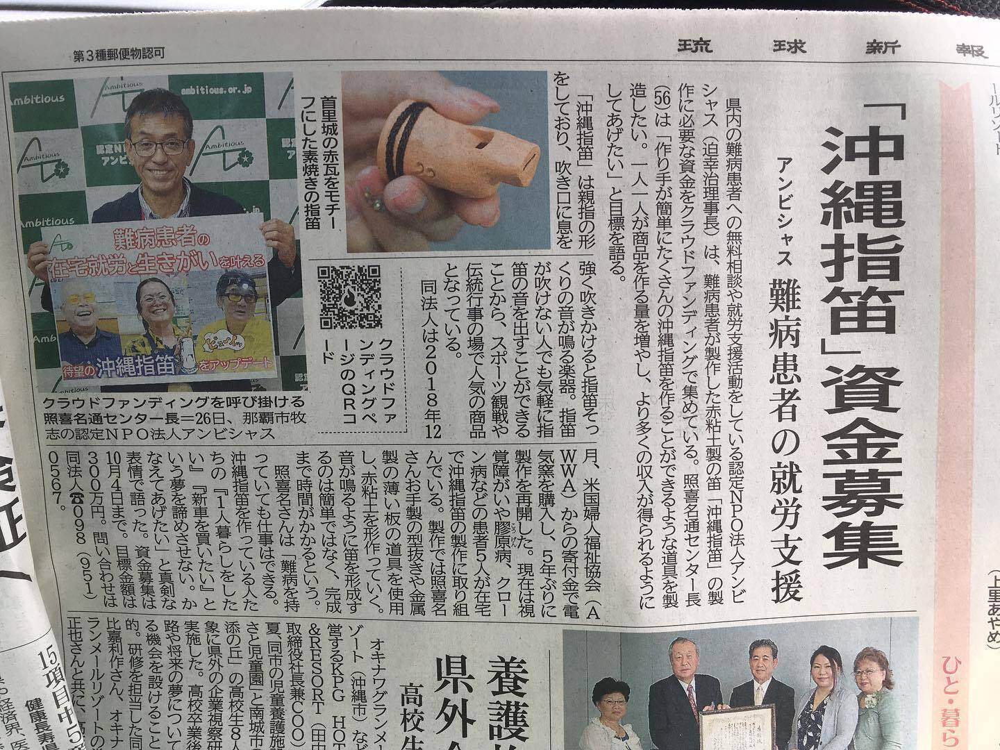 2019年8月31日 12:35「沖縄指笛」で難病患者の在宅就労と生きがいを クラウドファンディングで制作資金募集https://www.47news.jp/3946064.html?fbclid=IwAR2-5rlB859Z8hcgxfo9wU2uJJyPcsoWaTcXCcNclizWmFwGc_q5fVLIgyE