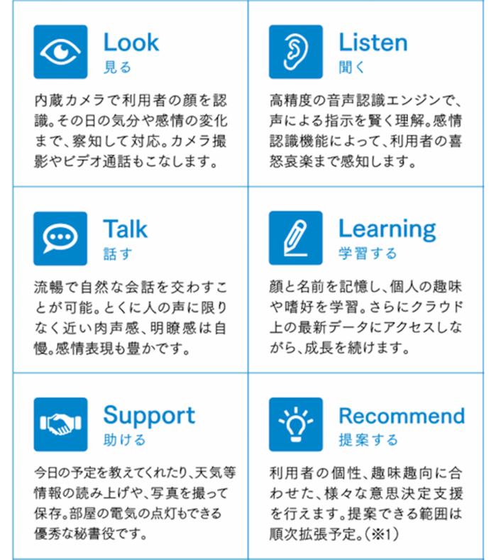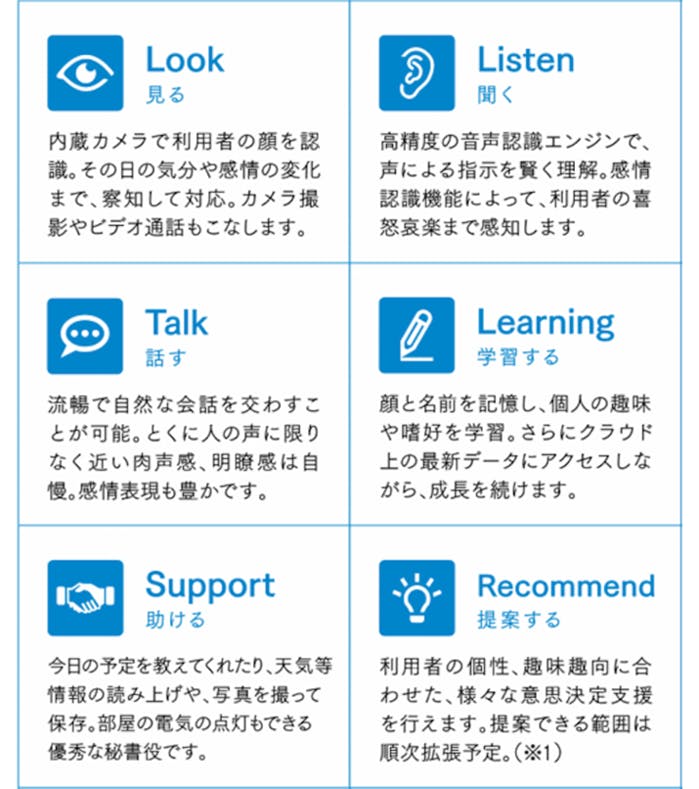 独自開発したAIにより、個人の特性、感情にあわせたコミュニケーションが可能です。家族の好き嫌い、趣味嗜好、生活習慣を次々と記憶し、食事や音楽の提案などの秘書機能を搭載。これらがすべて、「会話」で完結します。