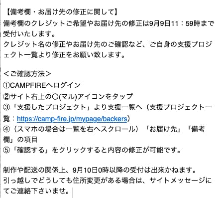 お知らせ クラファンの備考欄の締め切りは本日中です ご注意ください