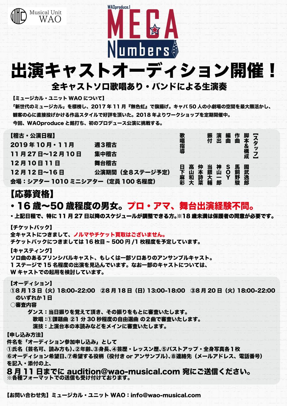 主演には若手ミュージカル俳優として活躍する高瀬雄史・新井海人の両名を迎え、WAOの新たな船出に力を添えてくれます。