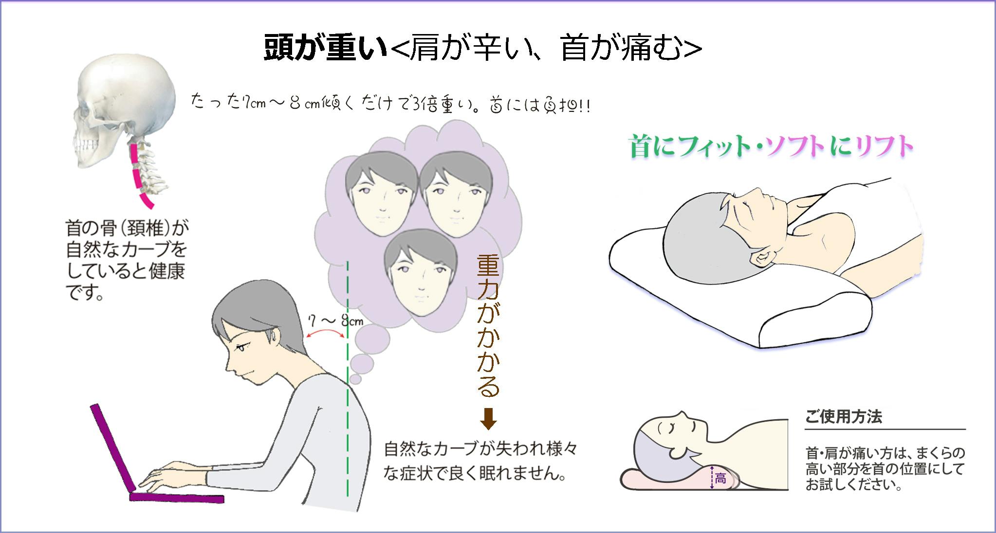 首と頭の軸が、重さでズレて痛みが出ないように、高さの調節はマクラが自分でいたします。