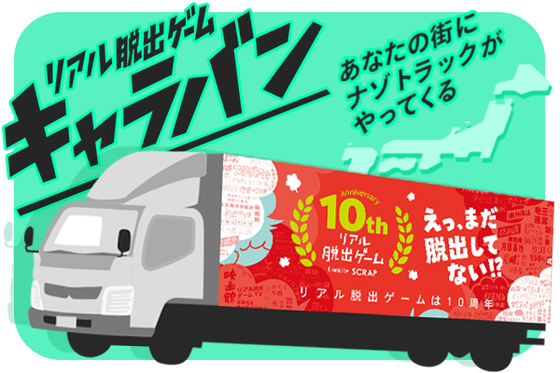 北海道から沖縄まで、日本に暮らす全ての人に思いっきり遊んでほしい!という願いを込め、あなたの街にリアル脱出ゲームを配達する「ナゾトラック」を走らせます!