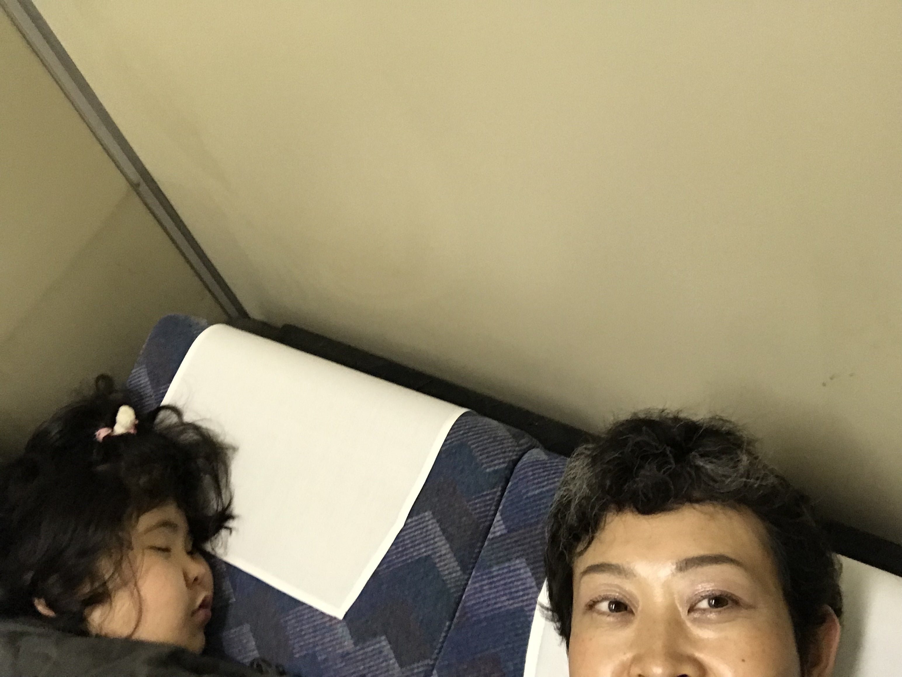 帰りの新幹線では椅子をフルフラットに倒して、別途で寝かせて帰りました。