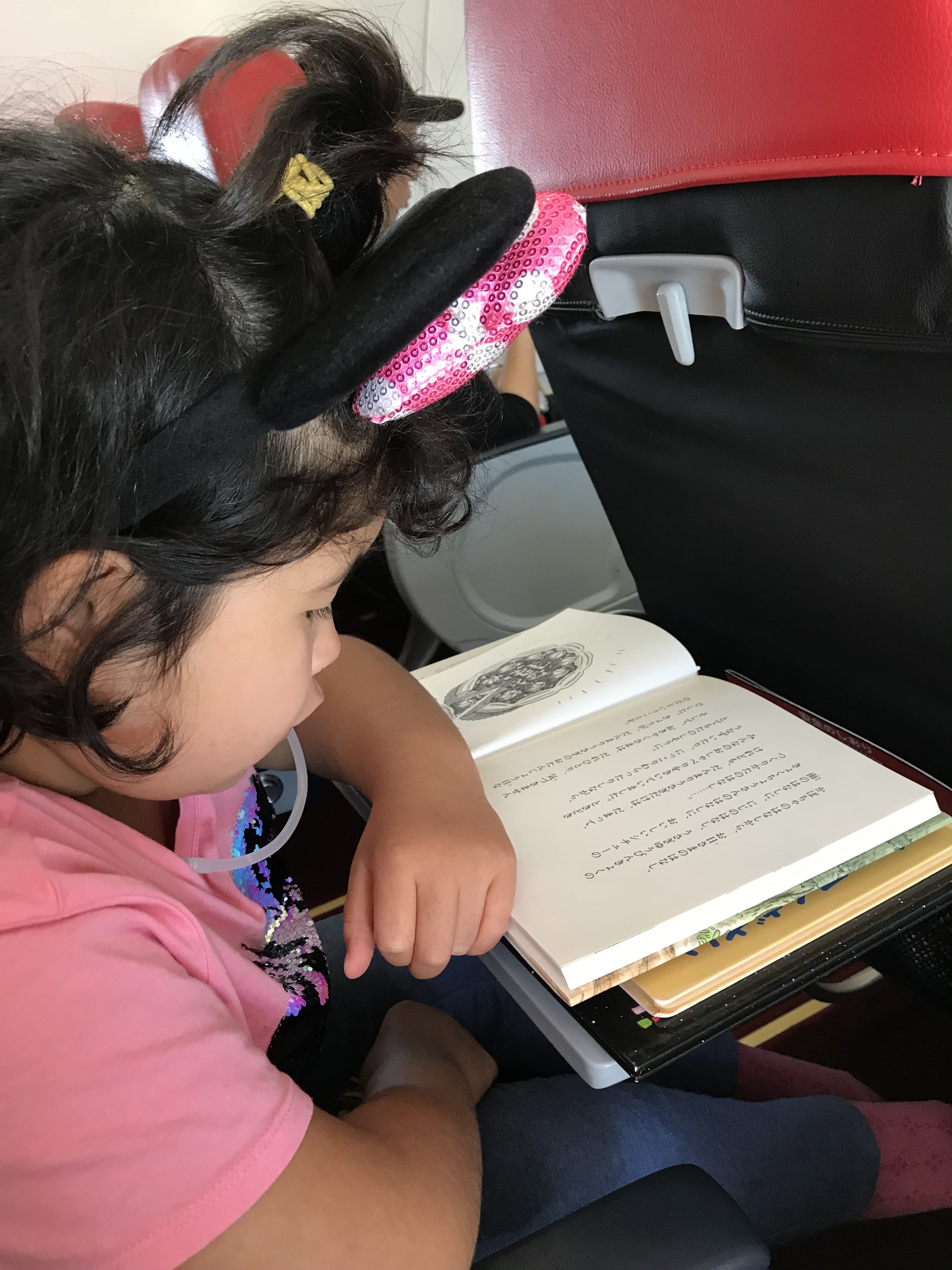 最近文字を読むのがブームの寧々さんは、機内にも絵本を4冊持ち込み音読。