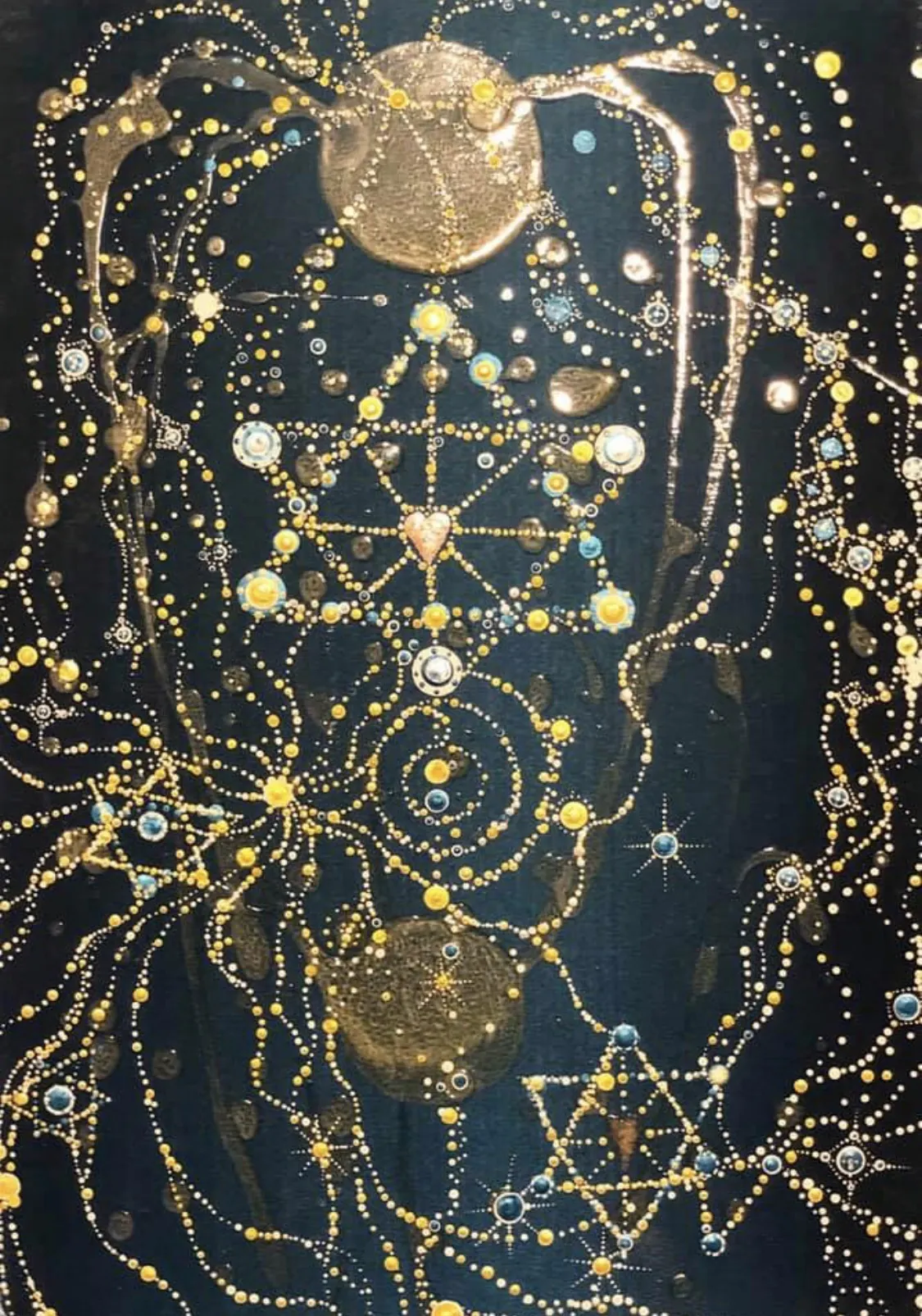 木の根のようにしっかりとした基盤もあり、水のように豊かで自由な流れが統合した世界。覚醒した日本の姿を現しています。パートナーシップを表現した金と銀の重なり合うペアのハートから愛が溢れ出しています。ペアのハートの中には五芒星が1つずつ入っています。お互いの叡智を現しています。