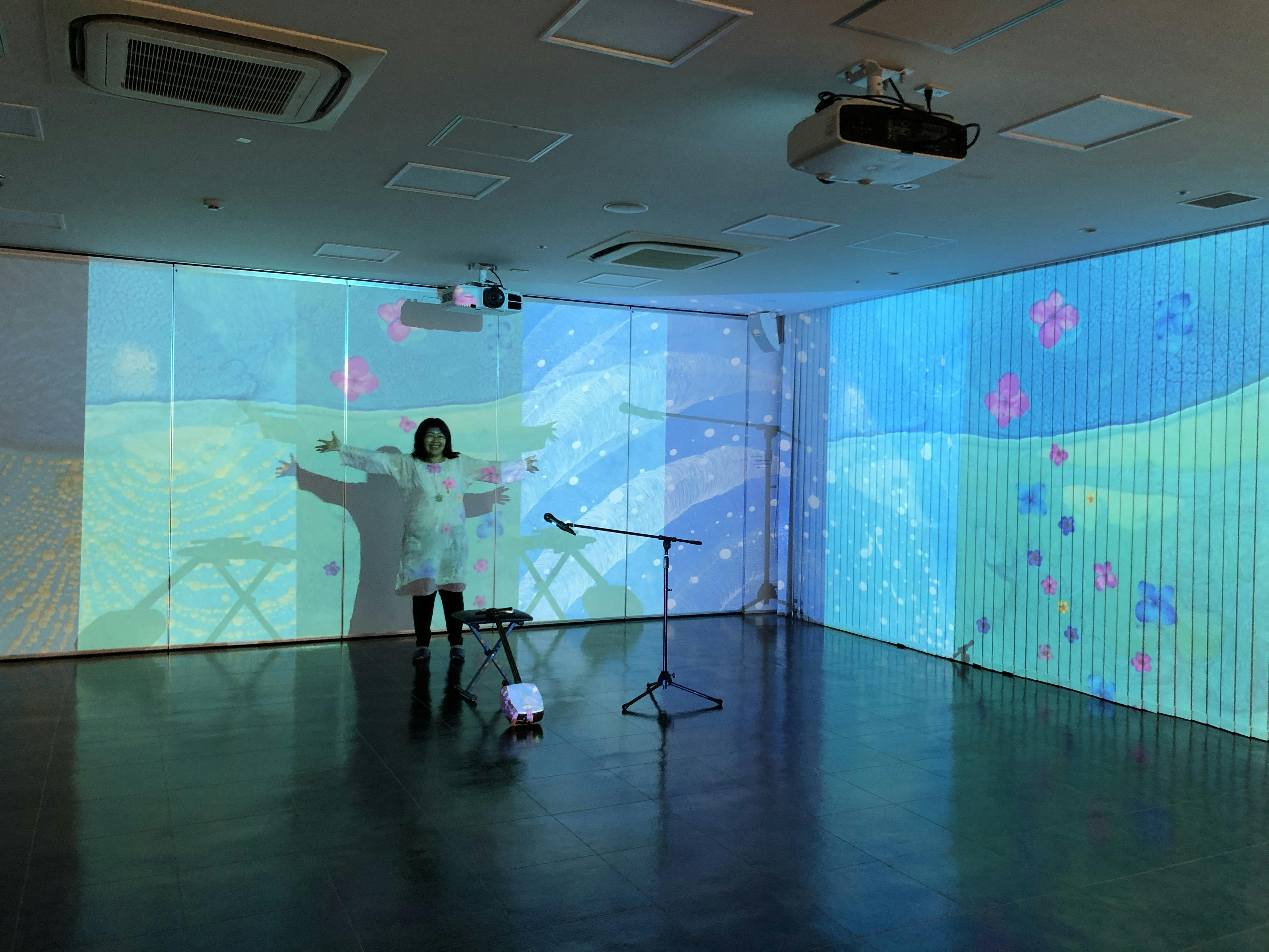 写真は、映像のお仕事の休憩中に自分の絵の中に入って遊んだ所です。