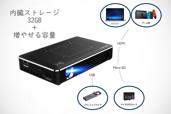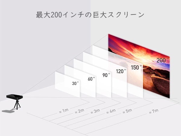 - 投射距離(約1m〜7m)によって30-200インチの大画面でお気に入りの映画、ゲーム、プレゼンテーション、youtubeなど幅広く対応できます。
