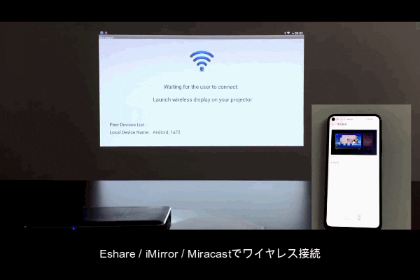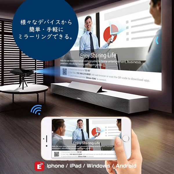 プロジェクターがWiFiスポットを構築し、専用アプリでミラーリングすれば、何処でも簡単に映像が共有可能となります。