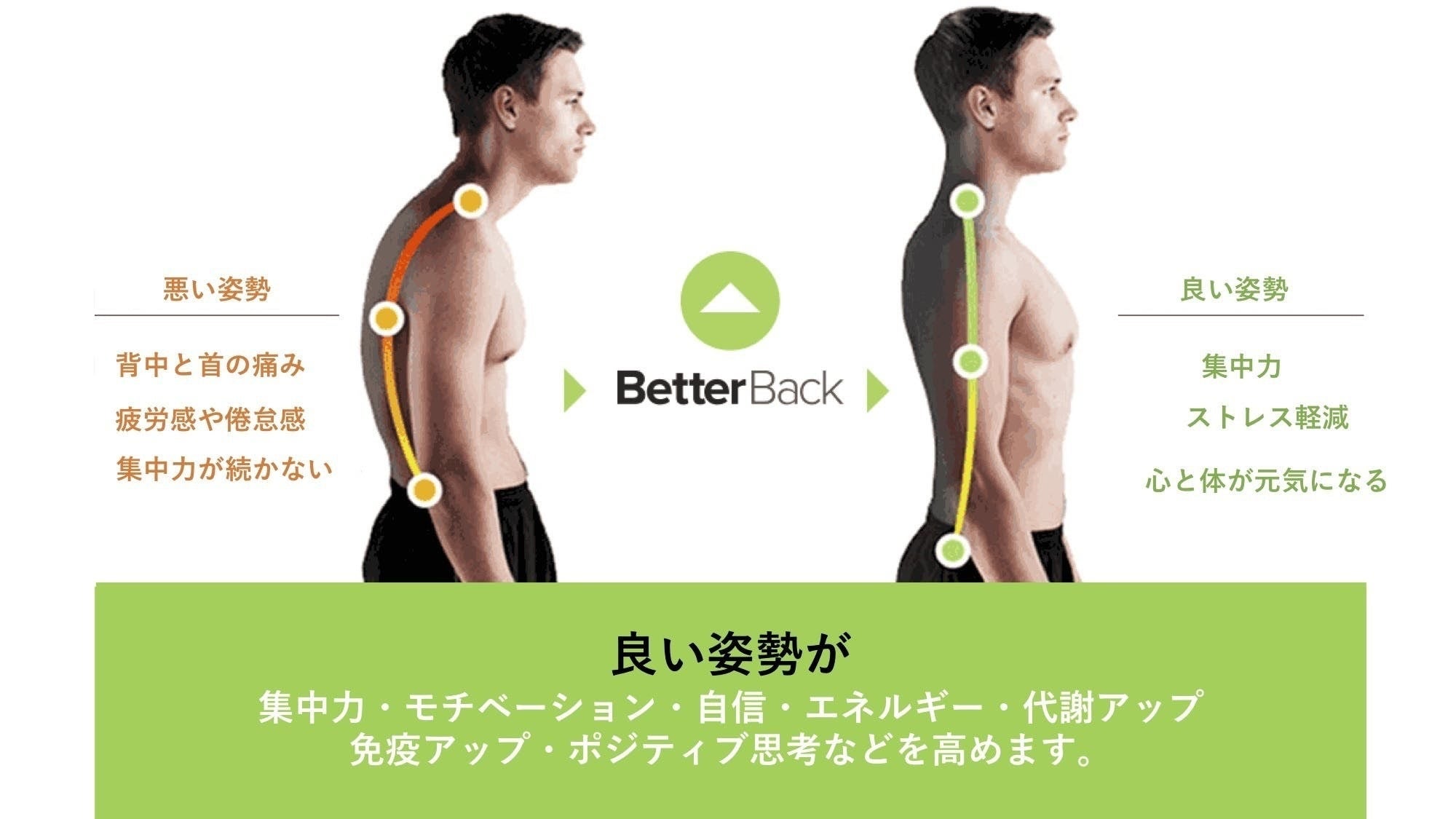筋トレでダンベルが重要な役割を果たすように、BetterBack Therapy「ベターバックセラピー」は姿勢維持のための筋肉形成をサポートし、自身のバランス、位置、緊張を感知する固有受容感覚を鍛えます。1日最低15分の着用で、立っている時や、BetterBack Therapyなしで座っている時の姿勢が改善されます。