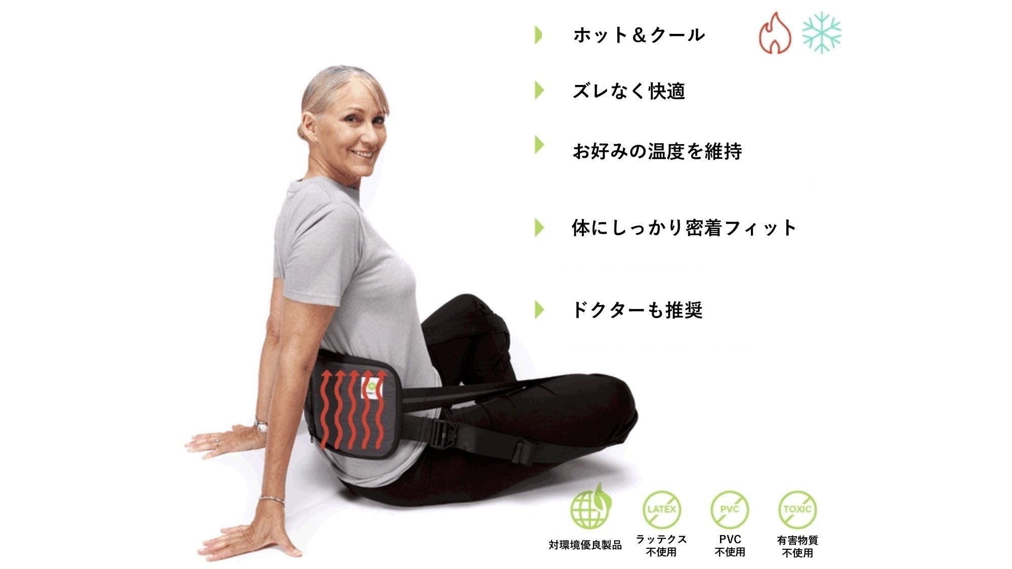 ヒートセラピーでは、温熱効果で腰背部筋肉への栄養供給を活発にすることで治癒力を高め、筋肉の凝りや、ひきつりをほぐします。また、コールドセラピーは負傷直後の応急処置、炎症ケアに最適です。どちらのセラピーでも薬に頼らず自然に痛みの緩和を促します。その際も両手は自由。BetterBack Therapy(ベターバックセラピー)を着用した状態で、弊社オリジナルのヒーリング・セラピーパックが体にしっかりと密着。ずれることもありません。