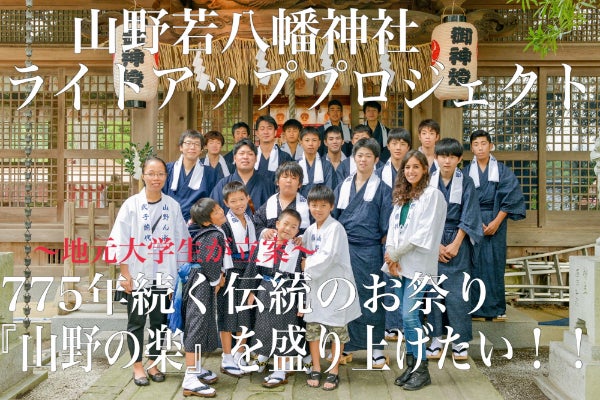 現在、大昔から町の顔でもあった「山野の楽」は地域人口の減少に伴い、見物人の減少など消滅の機に瀕しています。 そこで、「山野の楽」を盛り上げるために、開催場所である山野若八幡神社をライトアップすることで市外や県外の方に足を運んでもらい、『山野の楽』の魅力を知ってもらいたいとおもい、プロジェクトをスタートしました。