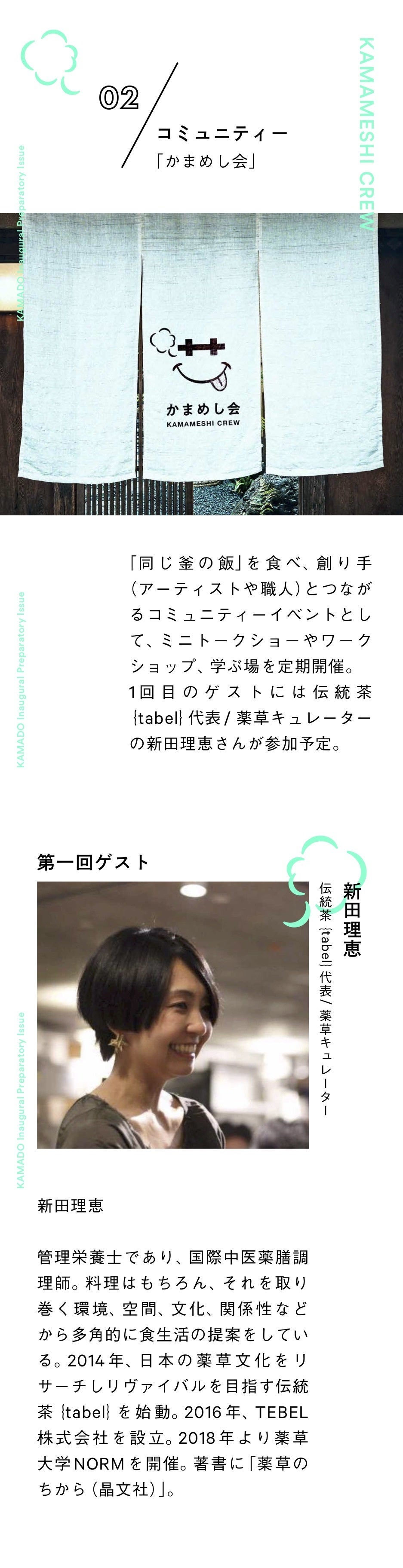 「同じ釜の飯」を食べ、創り手(アーティストや職人)とつながるコミュニティーイベントとして、ミニトークショーやワークショップ、学ぶ場を定期開催。1回目のゲストには伝統茶{tabel}代表/ 薬草キュレーターの新田理恵さんが参加予定です!
