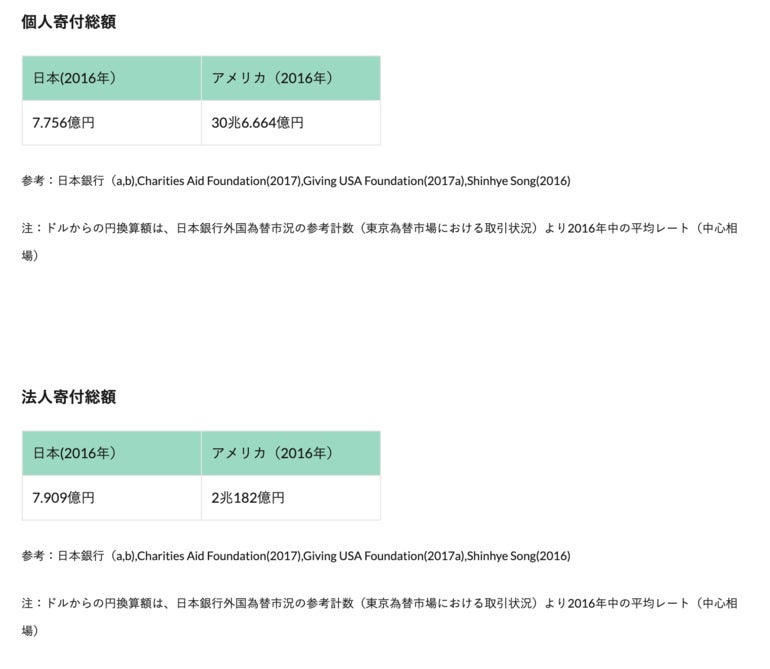 個人と企業に分けてみてみると、日本では個人寄付は7.756億円、法人寄付7.909億円。一方、アメリカは個人寄付30兆9,920億円、法人寄付2兆182億円になってます。 アメリカでは法人からの寄付よりも、一人ひとりの寄付額が多いのです。