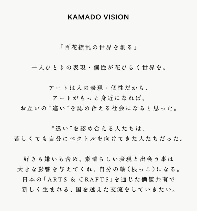 日本の「ARTS & CRAFTS」を通じて、価値共有の上で新しく生まれる、国を越えた交流をしていきたい。日本に生きる人、この世界に生きる人がそれぞれが出来ることで暮らしを楽しみ、健やかに人生を楽しんでほしい。