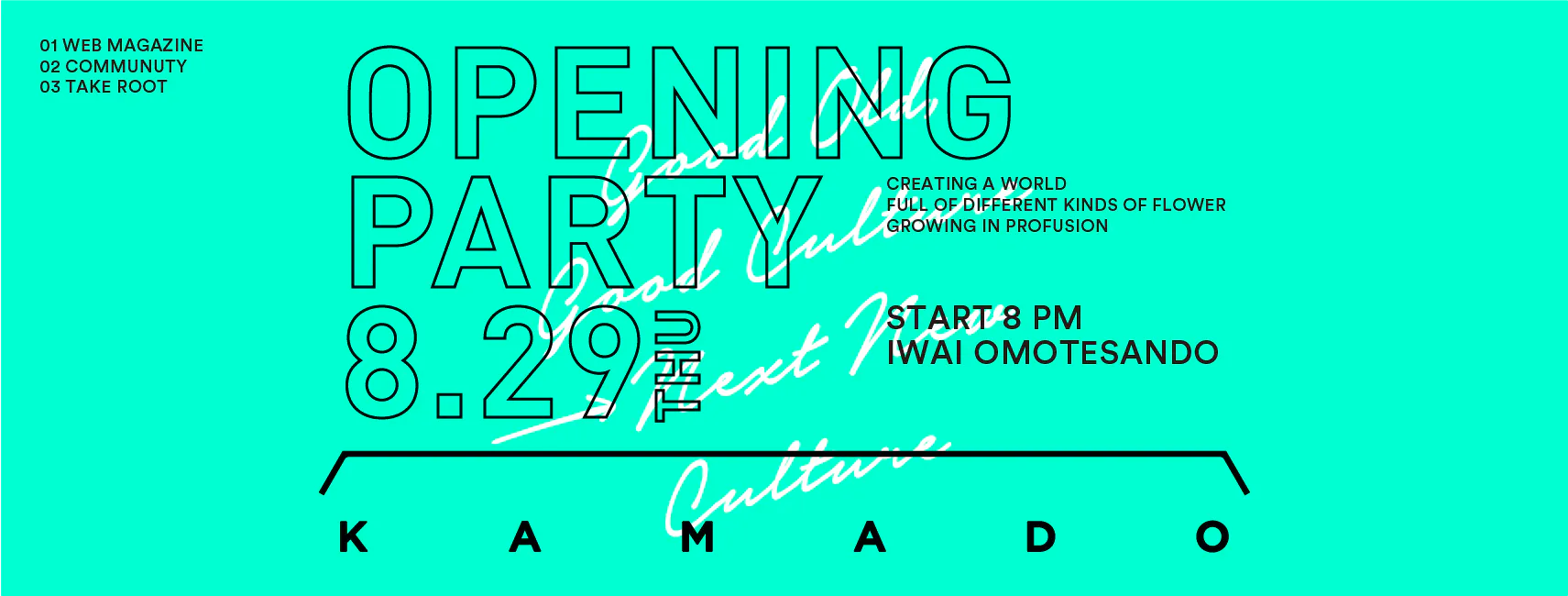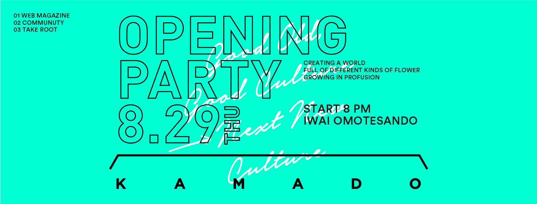 ・ オープニングパーティー参加権 ・・・8月29日(木)20時から表参道にあるIWAI OMOTESANDOでKAMADOのオープニングパーティーです。