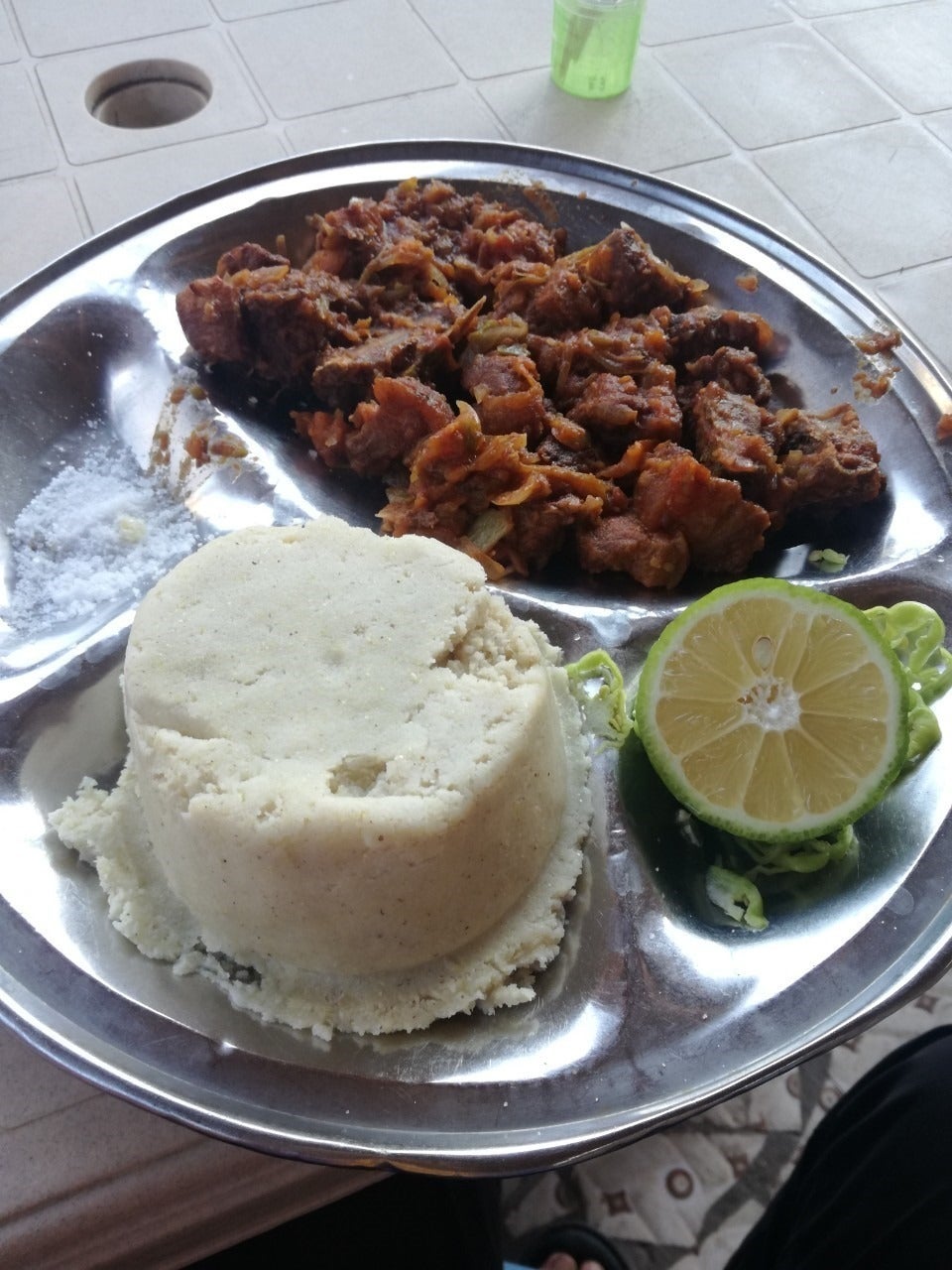 タンザニアのローカルフード。ウガリ(トウモロコシの粉でできた練り物)と豚肉は相性がとてもいい!
