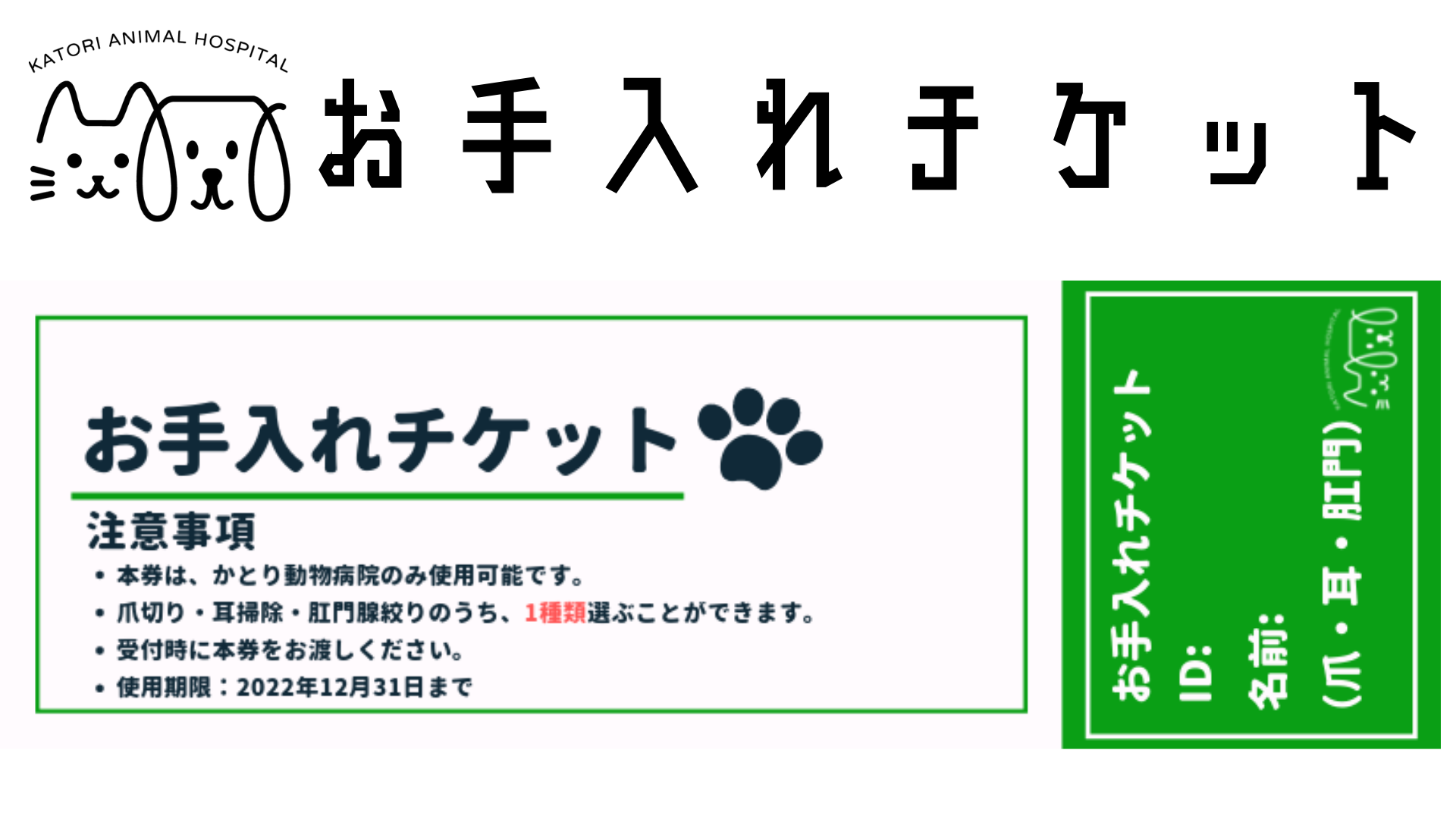 *お手入れチケット:耳掃除、爪切り、肛門腺絞りのいづれか選択となります。