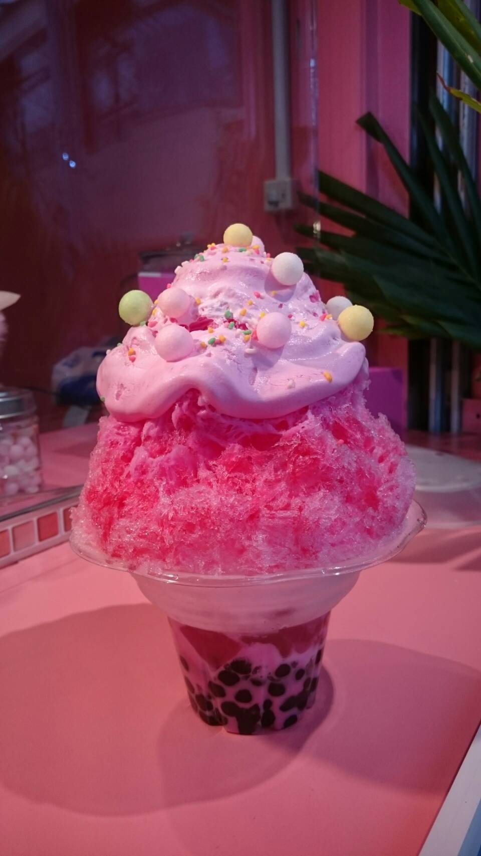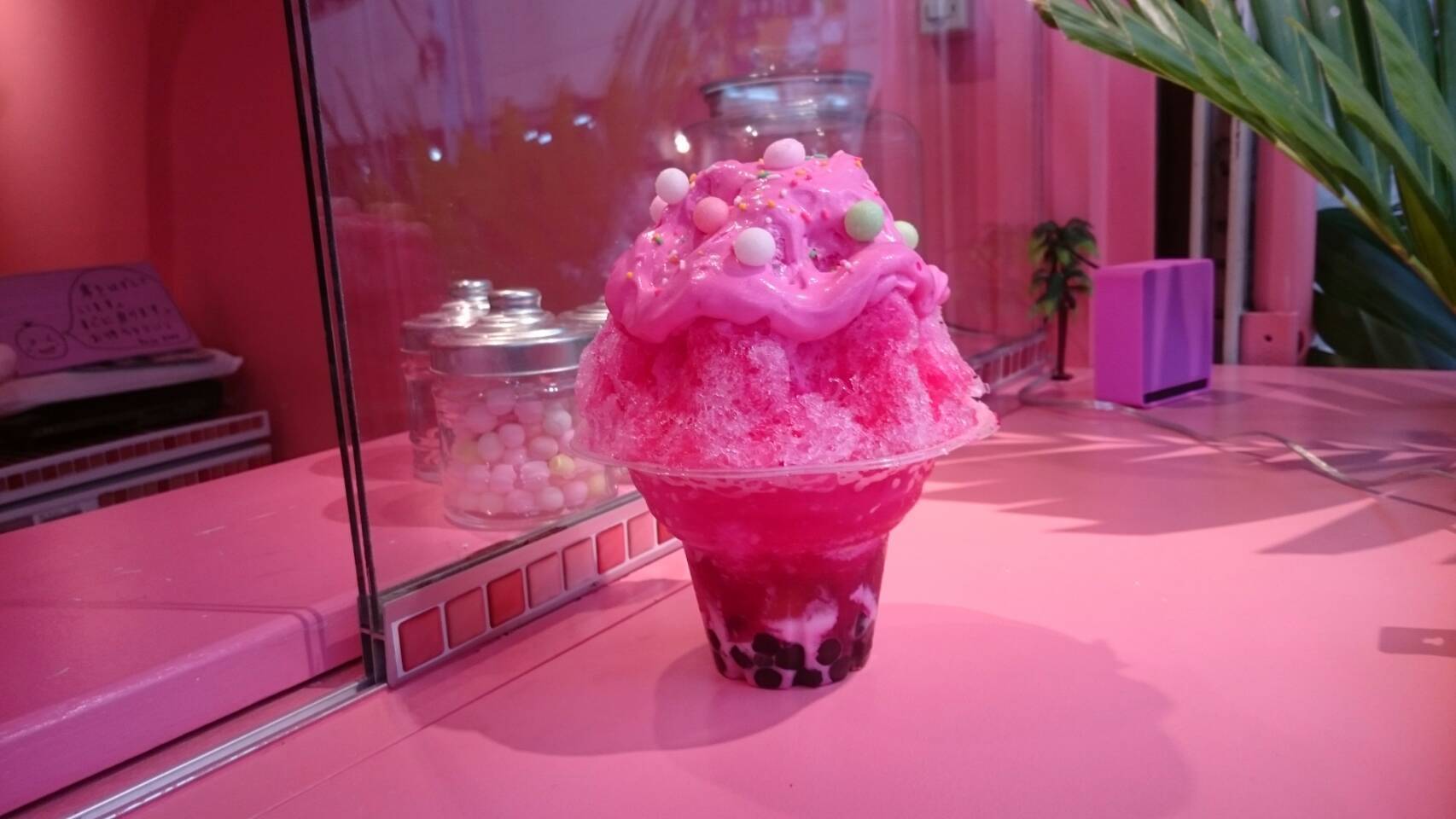 今年再ブームの台湾産タピオカとふわふわに削った氷の上に、"かき氷シロップ" を泡状にした