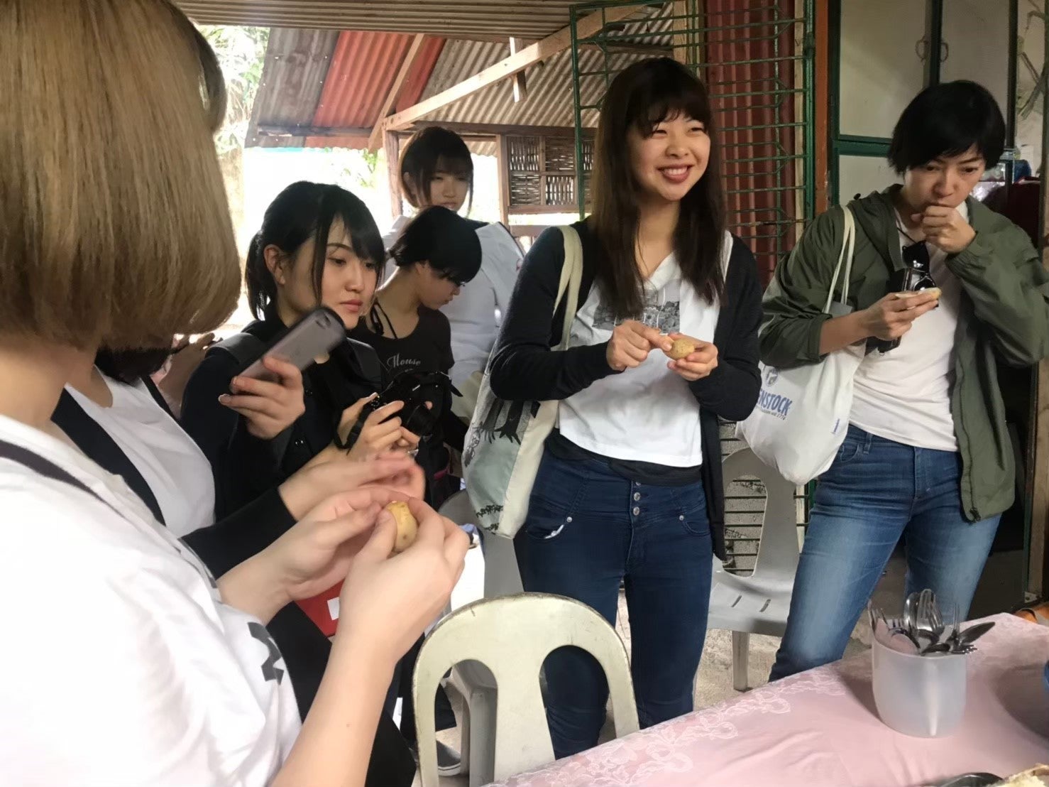 現地のフルーツを試食している様子。(共同代表青山は右から2番目。)