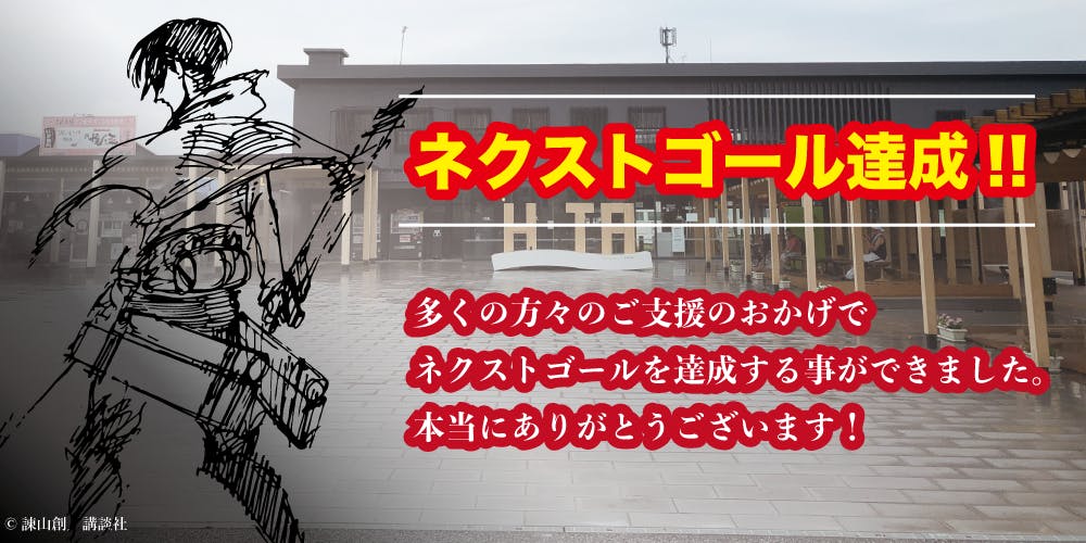 また、今回『日田駅前にリヴァイ兵長の銅像設置』をネクストゴールとし、2500万円を目標としておりましたが、この度、達成する事ができました。
