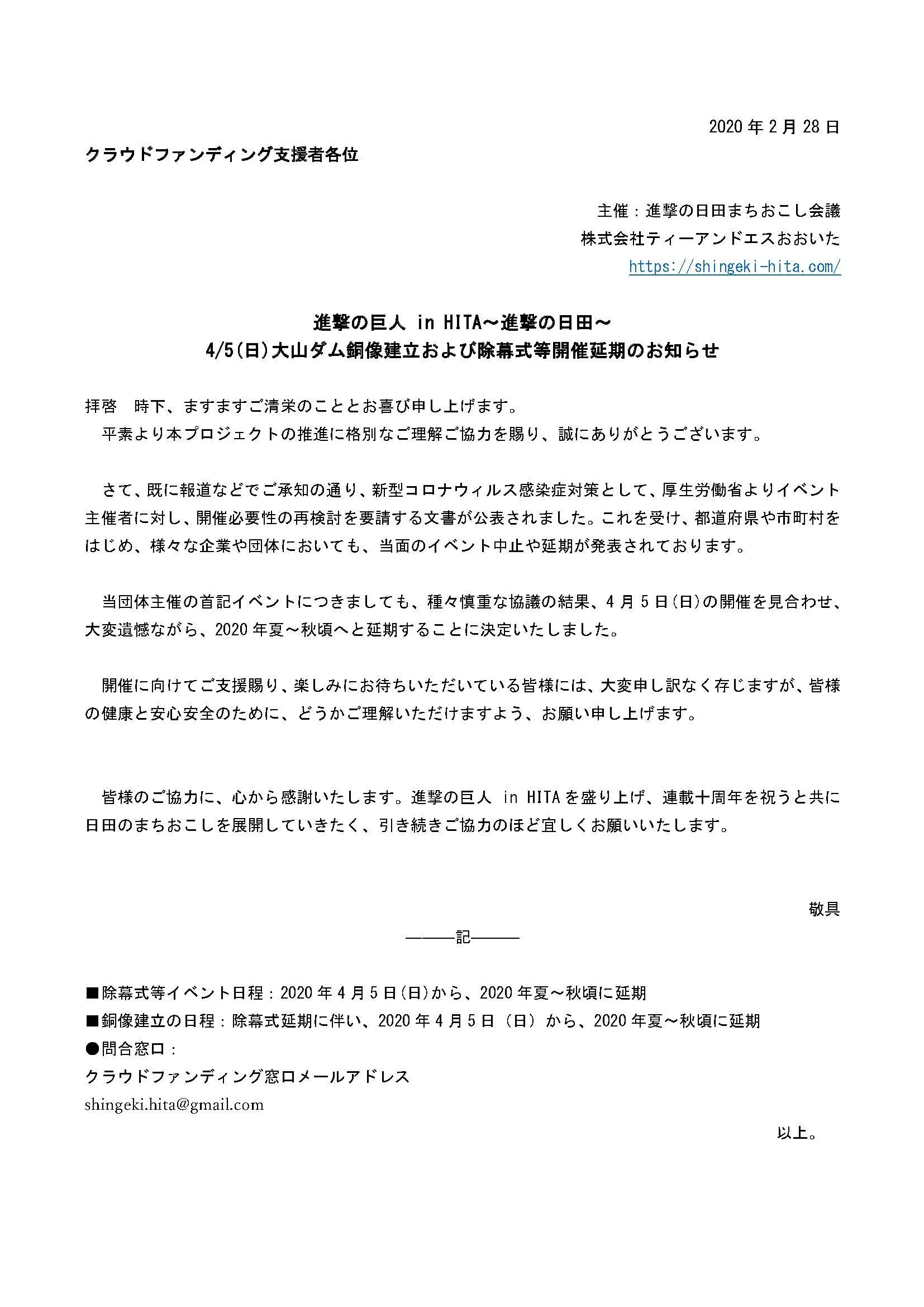 【進撃の巨人 in HITA~進撃の日田~4/5(日)大山ダム銅像建立および除幕式等開催延期のお知らせ】