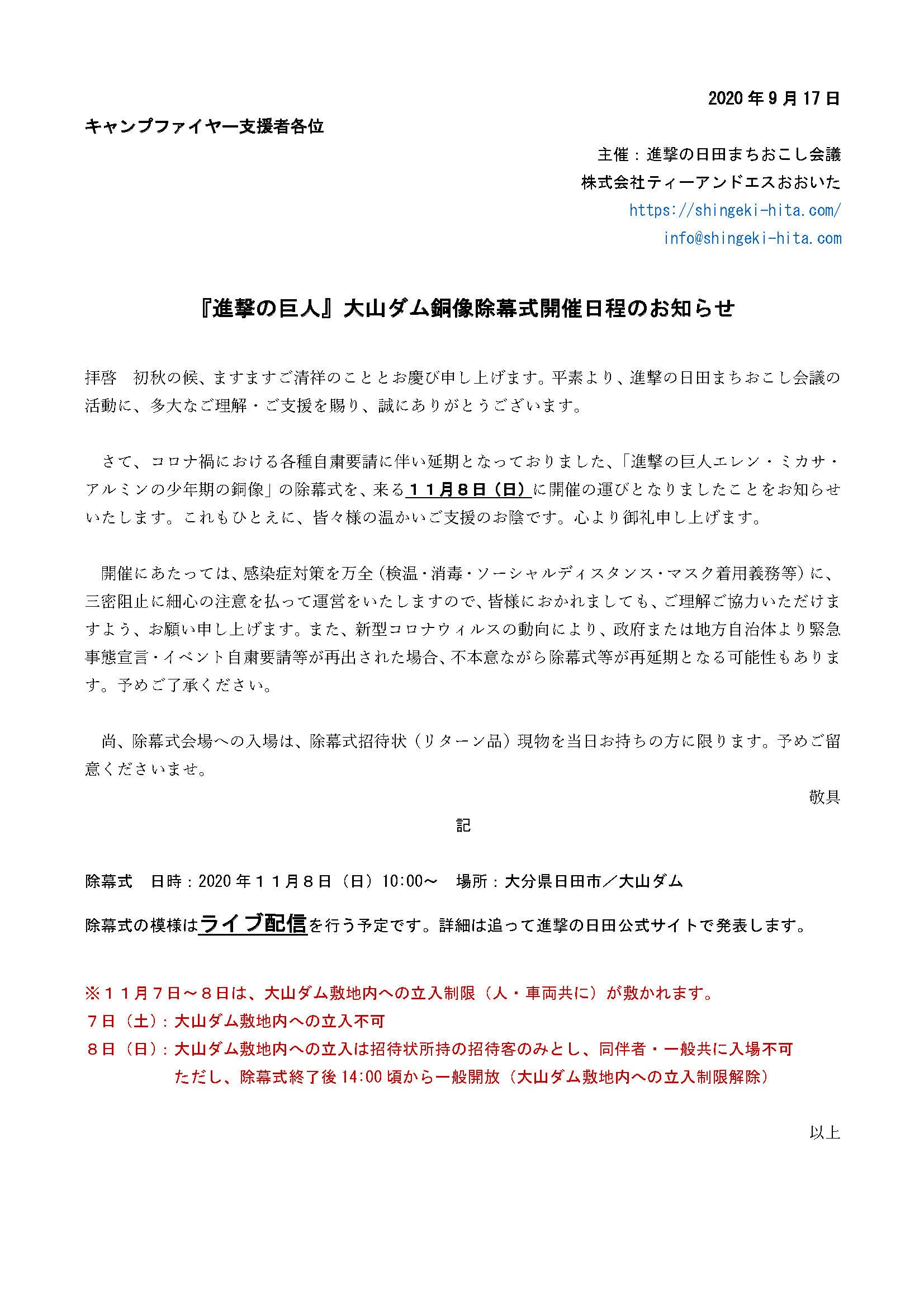 さて、コロナ禍における各種自粛要請に伴い延期となっておりました、「進撃の巨人エレン・ミカサ・アルミンの少年期の銅像」の除幕式を、来る11月8日(日)に開催の運びとなりましたことをお知らせいたします。これもひとえに、皆々様の温かいご支援のお陰です。心より御礼申し上げます。